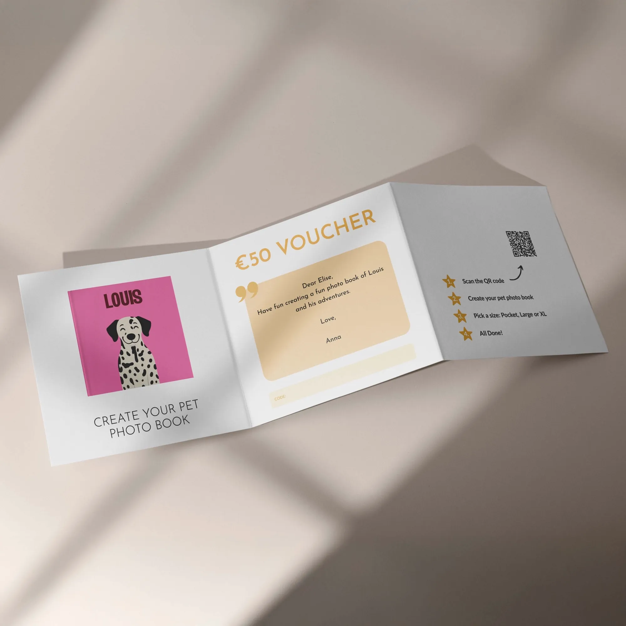 Quien reciba la tarjeta regalo aún podrá cambiar la portada, el título y el subtítulo de su libro de mascotas.
